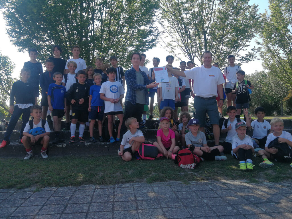 Winfried Schmitt, Ehrenjugendleiter des VfL Fontana Finthen, nahm Herrn Imhof gemeinsam mit ca. 40 gespannten Kindern des diesjährigen Camps in Empfang. Nach einer kurzen Ehrung und einem gemeinsamen Foto konnten die Kinder die Urkunde in Empfang nehmen. Auch dieses Jahr stellte der VfL Fontana Finthen wieder zwei tolle Sommercamps auf die Beine. In der ersten Woche beschäftigen sich die Kinder mit den Olympischen Spielen. Dabei probierten die Kinder neue und unterschiedliche Sportarten aus, zu denen verschiedene, spannende Wettbewerbe ausgetragen wurden. Im zweiten Sommercamp, stand neben dem Fußball die Nachhaltigkeit im Vordergrund. Gemeinsam erkundete die Gruppe die Natur und pflückte beim heimischen Bauern ihr eigenes Obst.